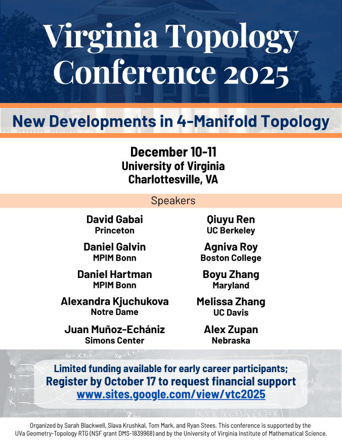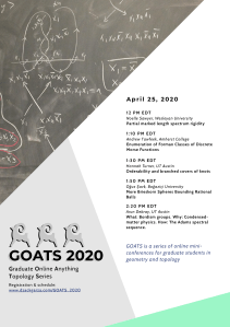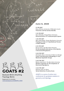 In 2020 I co-organized GOATS, a virtual mini-conference series for graduate students in topology and geometry, held on April 25, June 6, and July 18. See details here.