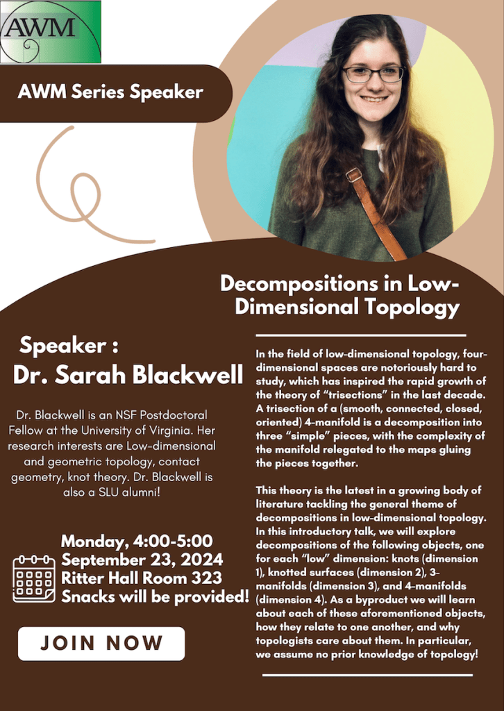- “Distinguish Knotted Surfaces With This One Weird Trick,” UGA Graduate Student Summer Conference, August 2021